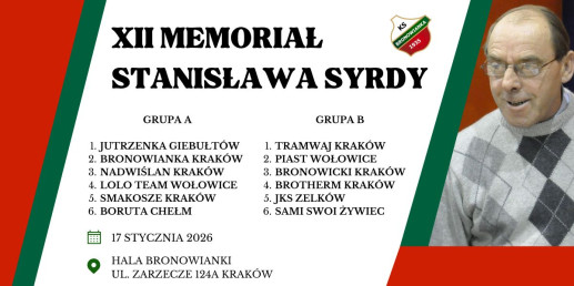 XII Memoriał Stanisława Syrdy odbędzie się w sobotę 17 stycznia 2026 r. w hali Bronowianki w Krakowie (ul. Zarzecze 124a). Udział w rywalizacji wezmą: Jutrzenka Giebułtów, Piast Wołowice, Bronowicki Kraków, Brotherm Kraków, Boruta Chełm, Smakosze Kraków, Tramwaj Kraków, Nadwiślan Kraków, Sami Swoi Żywiec, JKS Zelków, Lolo Team (Piast II) oraz gospodarze - Bronowianka Kraków.